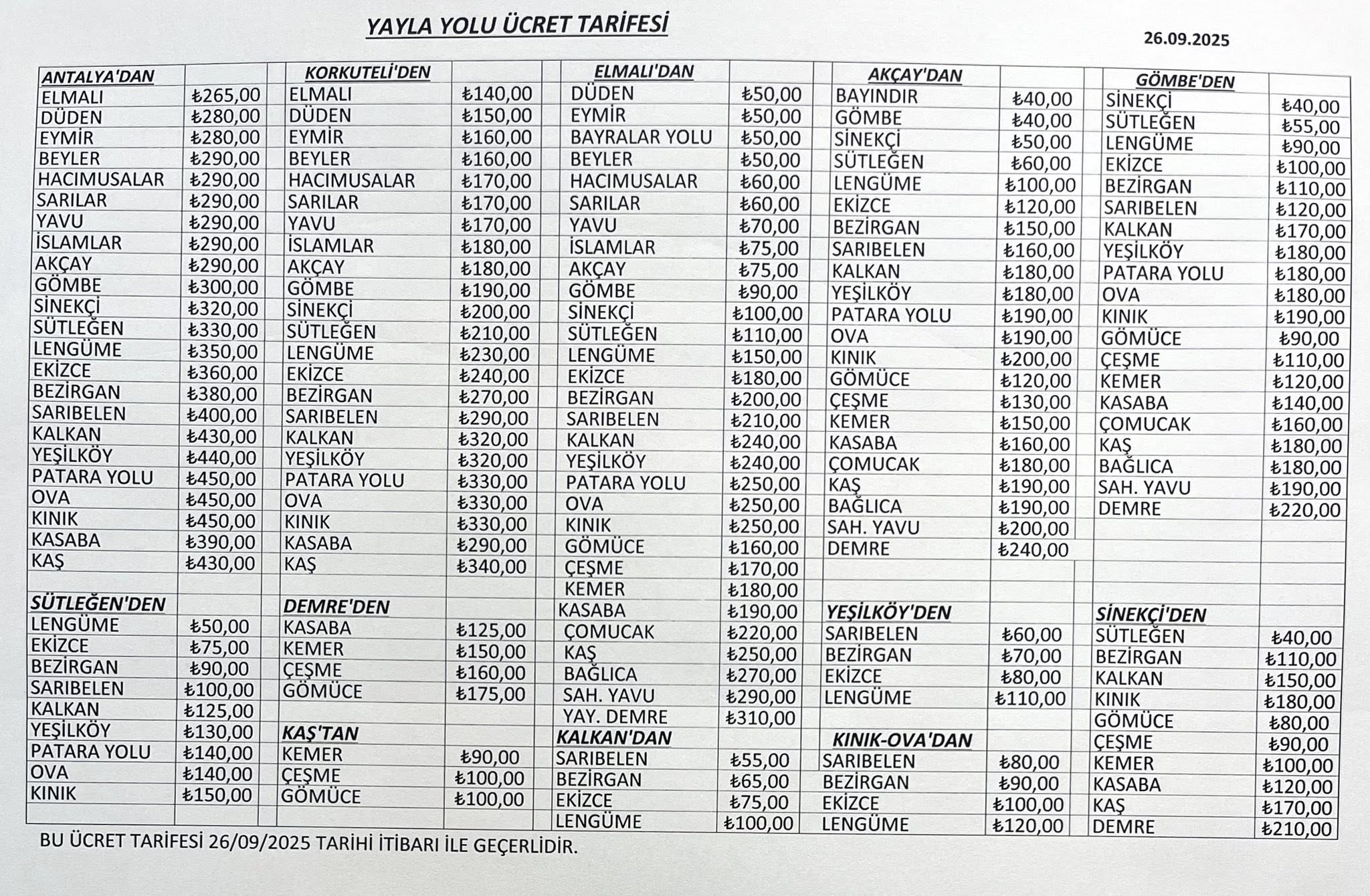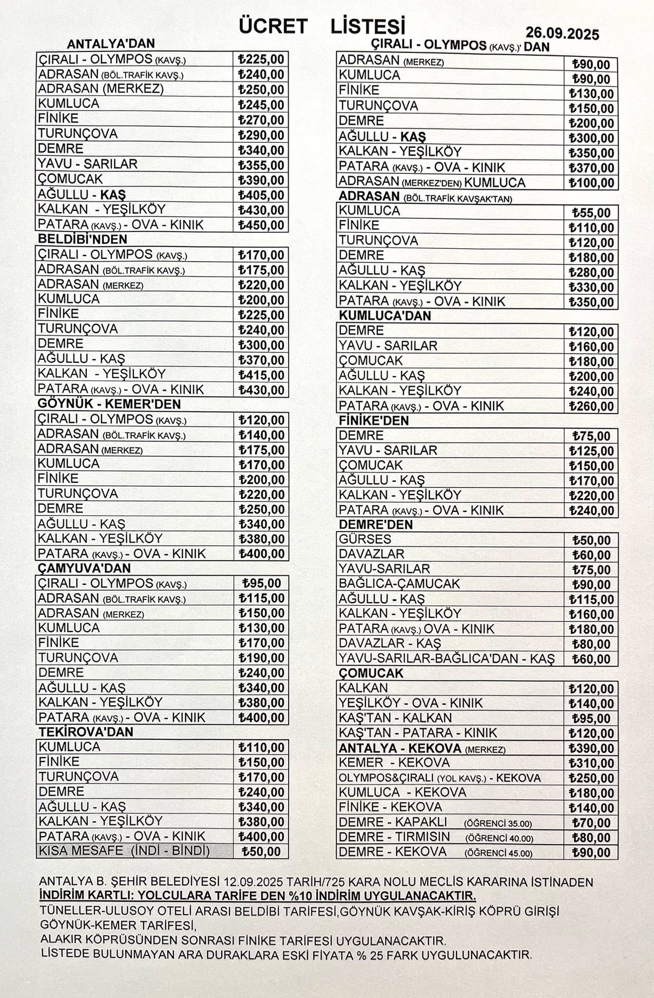 26 Eylül 2025 itibarıyla Antalya, Kemer, Kumluca, Finike, Demre ve çevre ilçelerden hareket eden yolcu taşımacılığı için güncel ücret listesi açıklandı.