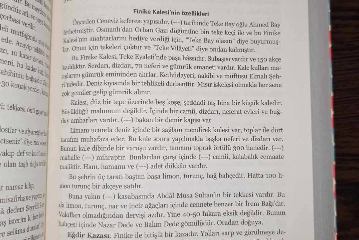 Çelebi ayrıca, Finike limanına çok sayıda geminin uğradığını ve buradan Mısır İskelesi’ne giden gemilerden yüksek gümrük gelirleri elde edildiğini özellikle vurgular. “Burası tehlikeli bir derbenttir” ifadesiyle Finike’nin stratejik önemini ortaya koyar.